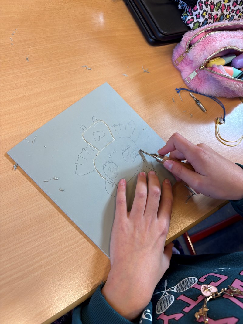 Groep 8 heeft afgelopen week een leuke knutselopdracht gemaakt. We zijn gestart met het ontwerpen van een patroon, waarbij er nagedacht moest worden dat dit in spiegelbeeld wordt getekend.